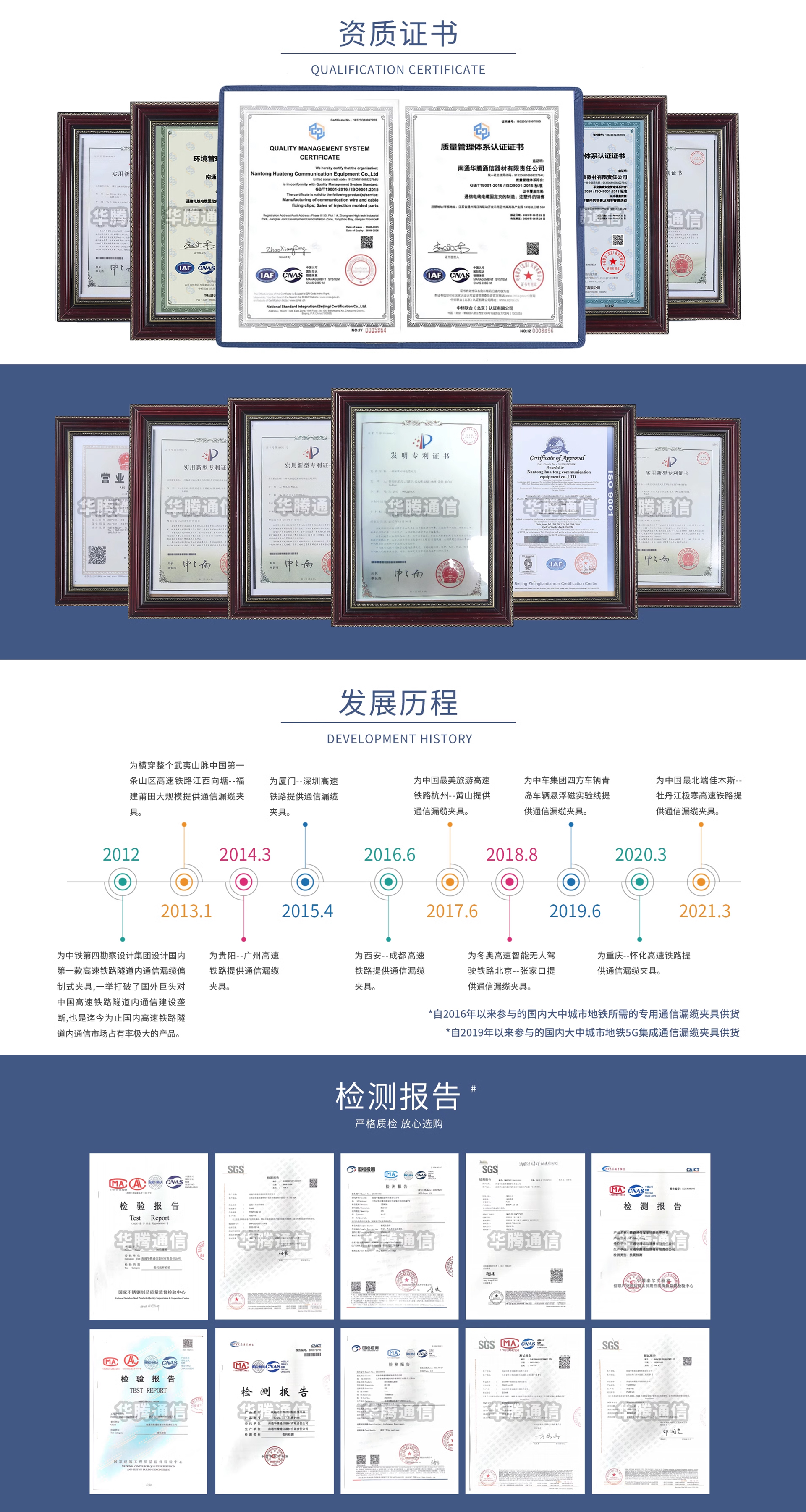 南通華騰通信器材有限公司,是集研發(fā)、生產(chǎn)制造與銷(xiāo)售高鐵GSM-R、GSM通信漏纜附件的專(zhuān)業(yè)性企業(yè),參與了我國(guó)大部分的高鐵線(xiàn)路通信的重大建設(shè),并向我國(guó)第一部關(guān)于《鐵路通信漏纜同軸電纜吊具》修訂標(biāo)準(zhǔn)委員會(huì)提供了許多具有建設(shè)性的建議草案,同中鐵第四勘察設(shè)計(jì)院集團(tuán)有限公司聯(lián)合研發(fā)了具有國(guó)際先進(jìn)水平的下一代超高速鐵路隧道內(nèi)通信漏纜夾具(發(fā)明專(zhuān)利號(hào):ZL201310682258.X專(zhuān)號(hào):ZL201420405407.8)使中國(guó)制造向中國(guó)創(chuàng)造邁入了堅(jiān)實(shí)一步,并···